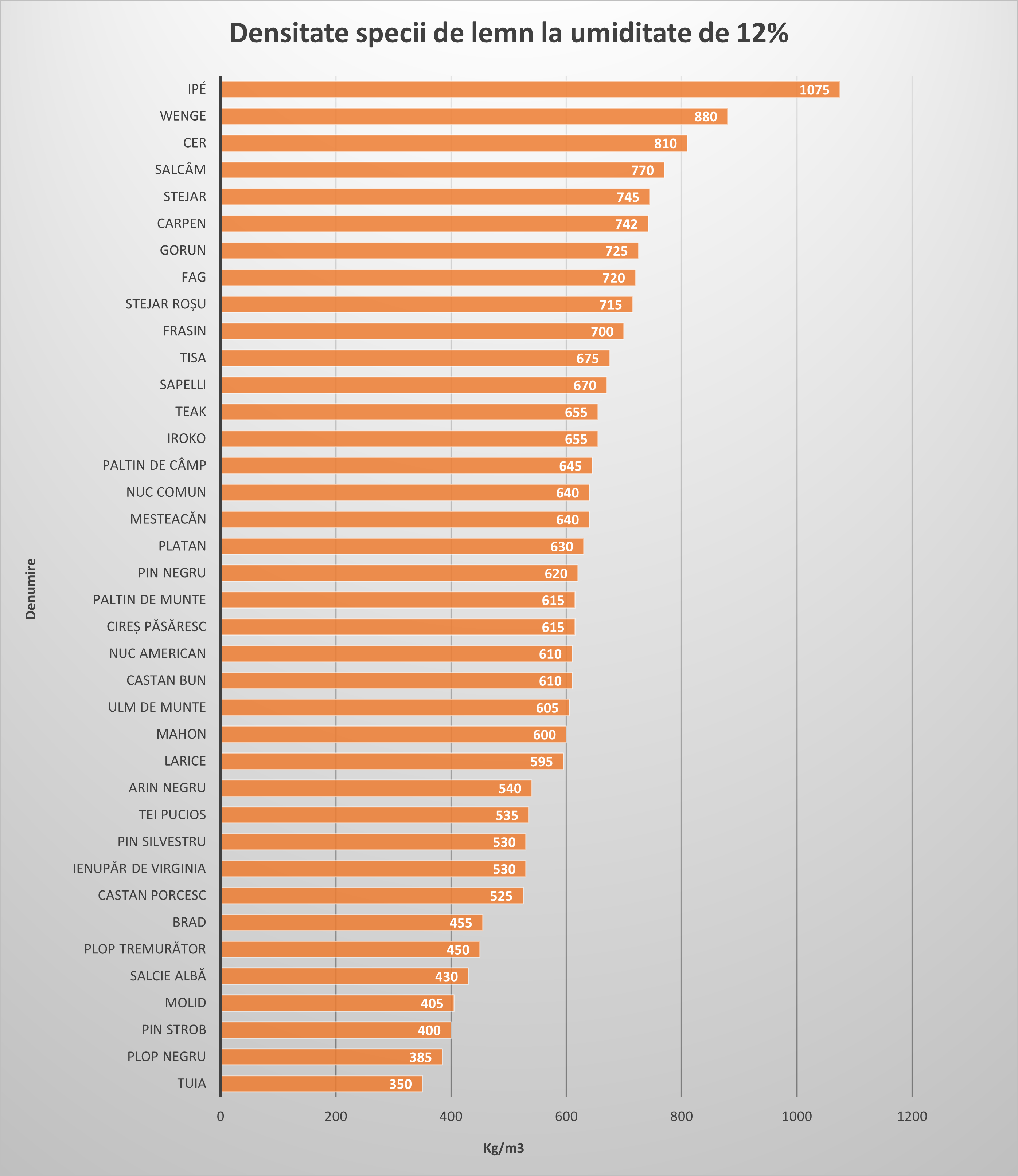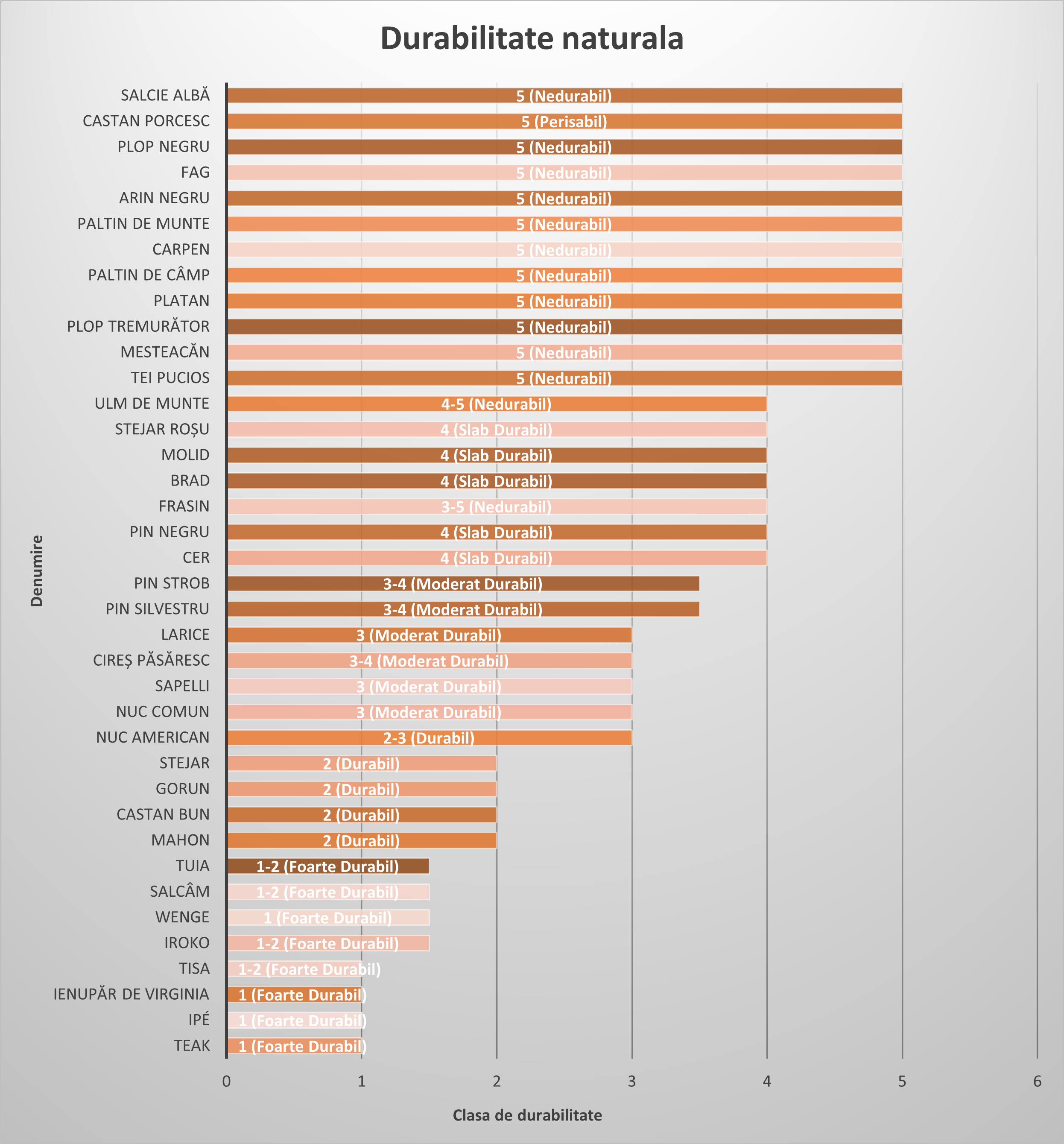 Stabilitatea dimensională: De regulă, speciile cu densitate mare prezintă coeficienți de contracție și umflare mai ridicați. Această informație avertizează tâmplarul că piesa va avea variații dimensionale mai pronunțate la schimbările de umiditate, necesitând tehnici de îmbinare care să permită „mișcarea” lemnului.