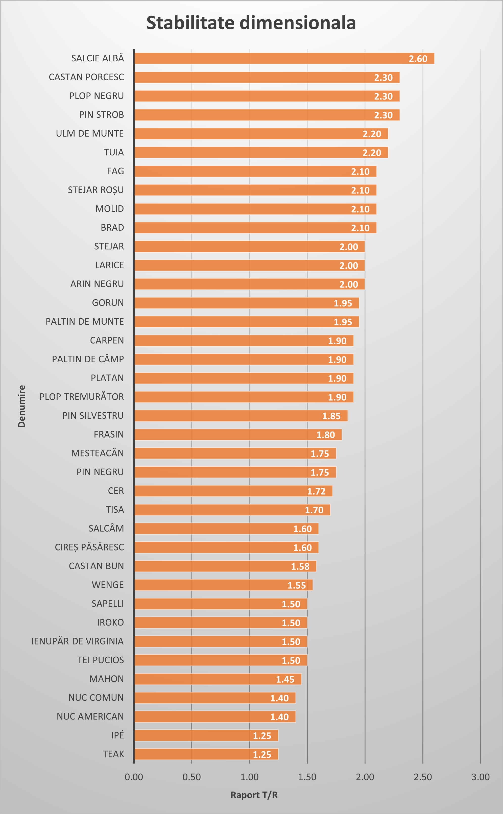 Cea mai fidelă unitate de măsură pentru a anticipa comportamentul unei specii de lemn este raportul T/R (Tangențial/Radial).